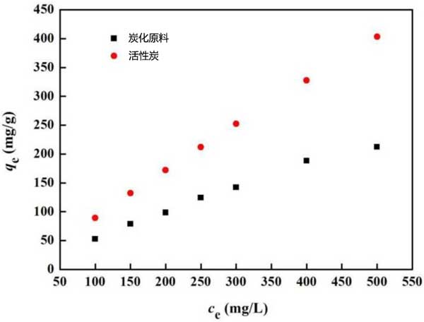 吸附等溫線:吸附等溫線對(duì)于描述溶質(zhì)如何與吸附劑相互作用非常重要,并且對(duì)于優(yōu)化吸附劑的使用至關(guān)重要。Langmuir等溫線假定單層吸附在含有均勻策略和吸附的有限數(shù)量的吸附位點(diǎn)的表面上,而在表面平面內(nèi)沒(méi)有吸附物的遷移。圖4顯示了柴油在所制備活性炭上的平衡吸附等溫線。從圖中可以看出,與炭化原料相比,活性炭的吸附等溫線更接近直線。隨著柴油溶液濃度的增加,活性炭對(duì)柴油溶液的吸附能力不斷增加。當(dāng)柴油濃度為500 mg/L時(shí),活性炭達(dá)到最大吸附量。然而,當(dāng)柴油溶液濃度達(dá)到400 mg/L時(shí),炭化原料的吸附容量增加緩慢?赡苁遣裼皖w粒覆蓋了材料的表面,導(dǎo)致吸附速率降低。從圖4中可以清楚地看出,活性炭的吸附能力明顯強(qiáng)于炭化原料。