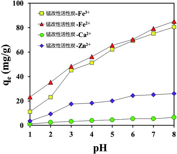 圖2:pH對(duì)高錳酸鉀改性活性炭吸附金屬陽(yáng)離子的影響。