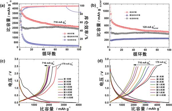 如圖4所示,從第一個(gè)循環(huán)的電壓分布中看出,兩個(gè)陽極的第一個(gè)循環(huán)的額外貢獻(xiàn)來自不可逆的固體電解質(zhì)界面層形成和電解質(zhì)分解。對于電化學(xué)表征,在紐扣電池配置中使用鋰金屬作為對電極對所有硅陽極進(jìn)行恒電流充電和放電。裸露的十億分之一硅陽極在第一個(gè)循環(huán)中提供3445mAhg的放電容量,庫侖效率約為65%。從第二個(gè)循環(huán)開始,二氧化硅的硅載納米纖維陰極的比容量值急劇下降至2600mAhg,而納米纖維的靜電紡絲陽極顯示出邊際下降,比容量為4000mAhg-1,庫侖效率均為約91%。比容量的急劇下降可歸因于二氧化硅的硅載納米纖維中的二氧化硅殼在第一次循環(huán)中不可逆鋰化。