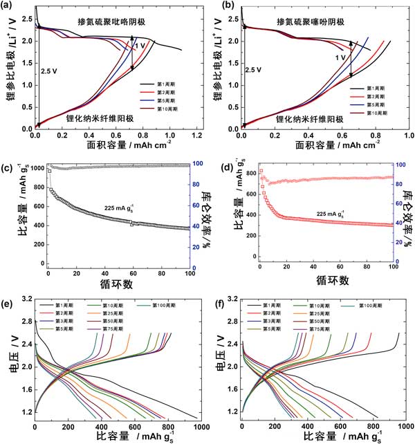 為了證明設(shè)計(jì)單個(gè)電極的可行性和相關(guān)性,用鋰化硅/納米纖維陽極代替金屬鋰以實(shí)現(xiàn)0.鋰-硅/硫全電池。為此目的,陰極和陽極都應(yīng)在半電池測試中實(shí)際實(shí)現(xiàn)的面積容量方面進(jìn)行平衡。在全電池配置中,硅陽極的脫鋰與硫陰極的鋰化密切相關(guān)。換句話說,硫陰極的放電將遵循硅陽極脫鋰的潛在和容量分布。