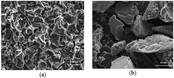 圖1:通過用(a)氫氧化鉀和(b)磷酸化學活化活性炭的微觀結構,通過SEM分析估計。