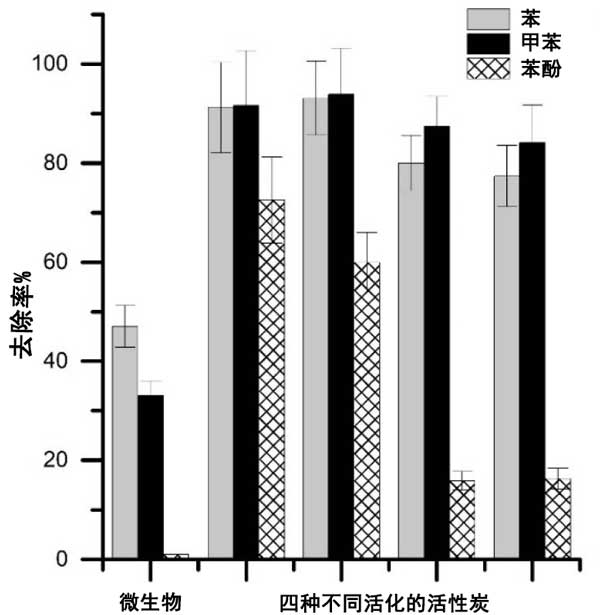 活性炭載微生物從油鹽水乳液中去除芳烴的能力如圖2所示。在與常規(guī)的氫氧化鉀活性炭被用作對照。特別是,使用常規(guī)的活性炭,苯和甲苯的吸附效率大于90%,而它們吸附苯酚的能力小于70%?梢酝ㄟ^考慮吸附物之間的極性差異來解釋這些結果。使用活性炭和載微生物活性炭的苯酚去除效率之間的比較顯示了通過微生物固定修改活性炭孔隙空間的方式。由于施氏假單胞菌消耗苯酚的能力較低,因此去除嚴格限于吸附過程。
