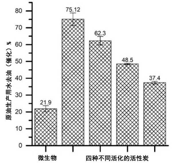 分別使用微生物和四種活性炭24小時后,油-鹽水乳液中去除的原油總量分別為21.9%,75.1%,62.3%,48.5%和37.4%。通常,常規(guī)活性炭去除了比活性炭載微生物材料更高量的原油。這可能是由于吸附對的高物理化學親和力,可以通過范德瓦爾斯相互作用來控制。活性炭的高孔隙率有益于原油組分的物理吸附。去除基礎材料和載微生物材料之間的差異在于不同量的可用活性位點,其在微生物材料中較少,因為微生物沉積在孔中。通過考慮活性炭以更大比例固定微生物并呈現(xiàn)更好的多孔性質來解釋這些發(fā)現(xiàn)。