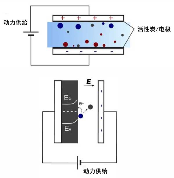 電吸附效應(yīng)包括向半導(dǎo)體氣體傳感器的敏感層施加外部電場,以改變其感應(yīng)行為。當負電分子接近薄金屬導(dǎo)體的表面時,自由電子從固體表面被吸引。重要的是,如果處理具有較少可用位移電荷的半導(dǎo)體(例如活性炭),則靜電吸引所涉及的層的厚度將較大,而電導(dǎo)率將較低。半導(dǎo)體電性能的這種變化是金屬氧化物(MOS)氣體傳感器的基本操作。如果將所述系統(tǒng)放置在電場之間,例如通過在兩個電極之間施加電壓來感應(yīng),該電場可能會迫使電子朝向(或遠離)(半)導(dǎo)體表面,從而降低(或增加)吸附某些氣態(tài)物種(圖1)。