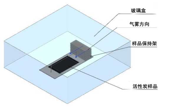 活性炭關(guān)于電場附增強吸附測試設(shè)備,由一個樣品架組成,樣品架放置在一個33厘米×33厘米×12厘米的帶有硼硅酸鹽玻璃壁的盒子內(nèi)(圖3)。風(fēng)扇(位于偏轉(zhuǎn)板后面)引起平行的空氣通量到樣品。在細的(直徑為180 µm)鎢絲電極(放電電極)上施加正電勢,而相對電極(活性炭)通過兩端的兩個接地連接接地。