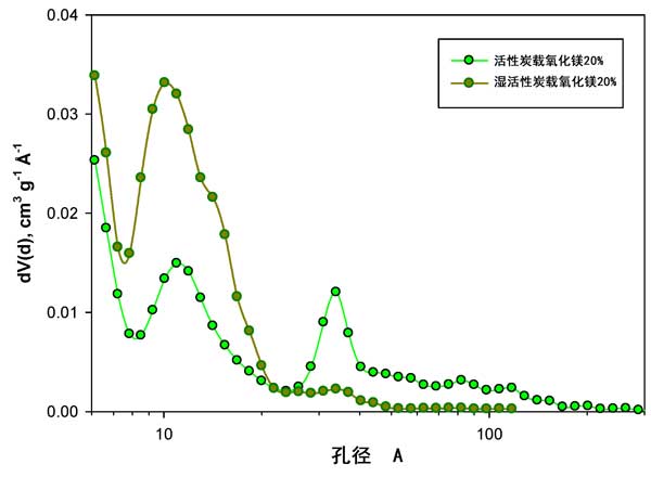 初步的TG分析20%氧化鎂負載量的活性炭與釋放的氣體進行IR分析表明,硝酸鹽的分解在400°C以下完成。在此溫度以上,僅發(fā)生了Mg(OH)2緩慢轉變?yōu)镸gO的情況。因此,所有在600°C下處理過的催化劑均由分散在活性炭上的MgO組成,而沒有硝酸鹽前體鹽的殘留。圖1報告了不同負載下的活性炭和負載了氧化鎂的活性炭催化劑的孔徑分布(PSD)。