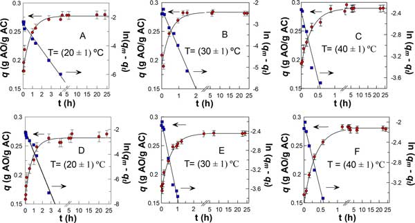 圖1顯示了典型的動力學(xué)圖,說明了沒食子酸和沒食子酸丙酯在平衡(q)時每質(zhì)量活性炭吸附的抗氧化劑的量隨時間的變化。還顯示了在不同溫度下至少三個半衰期(相關(guān)系數(shù)>0.99)的相應(yīng)一階圖。在所有情況下,吸附曲線均顯示在4h后達到平衡,并至少維持24h,這是后續(xù)研究的時間。