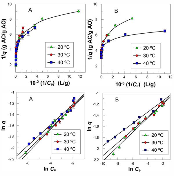 在不同的活性炭量下,評估了溫度(T=20–40°C)對沒食子酸和沒食子酸丙酯吸附過程的影響。實驗吸附平衡數(shù)據(jù)擬合到兩個等溫線模型,Langmuir和Freundlich方程,并評估了擬合優(yōu)度。圖2。在研究的交流范圍內(nèi)獲得了非線性圖。因此,結(jié)果表明該模型不適用于描述沒食子酸和沒食子酸丙酯在活性炭上的吸附。注意,在任何給定的活性炭質(zhì)量下,溫度的變化都會導(dǎo)致沒食子酸和沒食子酸丙酯的吸附能力發(fā)生非常小的變化,差異小于2%。