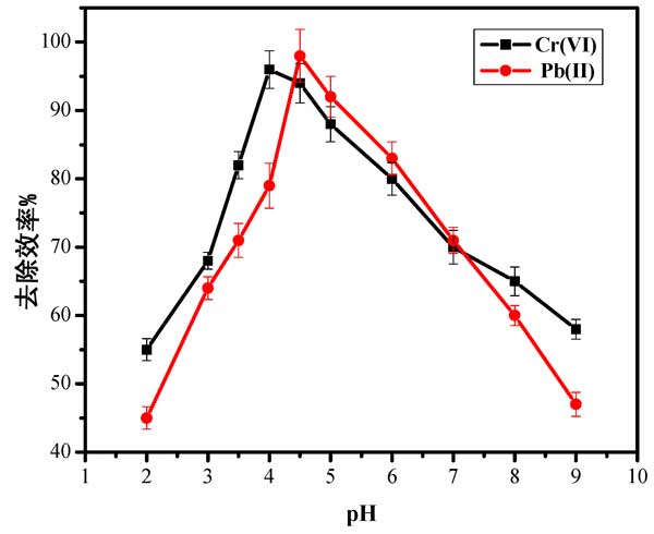 pH的影響:系統(tǒng)的吸附效率在很大程度上取決于溶液的pH值。圖2中顯示的數(shù)據(jù)突出顯示了pH值對Pb(II)和Cr(VI)離子在活性炭上的吸附的影響。在pH 4.6和4下,Pb(II)和Cr(VI)的吸附增加并達(dá)到最大值。pH值高于6時(shí),吸附活性降低。這可以歸因于游離離子的減少是由于在較高的pH范圍內(nèi)形成羥基配合物,金屬離子隨后沉淀。因此,去除效率急劇下降。另一方面,在低于合適pH的pH值下,H+和金屬離子爭奪活性炭表面上相同活性位點(diǎn)上的相同活性位點(diǎn)可能會(huì)阻礙吸附活性。