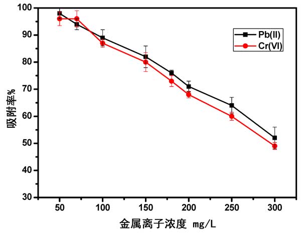 金屬離子濃度的影響:使用0.80 g和1.00 g的活性炭在50至300 mg/L的各種濃度的Pb(II)和Cr(VI)濃度下進(jìn)行Pb(II)和Cr(VI)離子的吸附。圖3中的結(jié)果表明,Pb(II)和Cr(VI)離子的最大吸附量分別為50和70 mg/L。這可以歸因于以下事實(shí):隨著濃度的增加,活性部位被覆蓋并飽和。