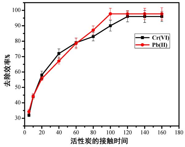圖4:時(shí)間對活性炭上鉛(II)和鉻(VI)離子去除效率的影響。