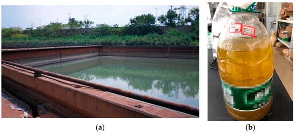 圖1:采樣地點和廢水樣本。(a)污水處理池;(b)未經(jīng)處理的廢水樣品。
