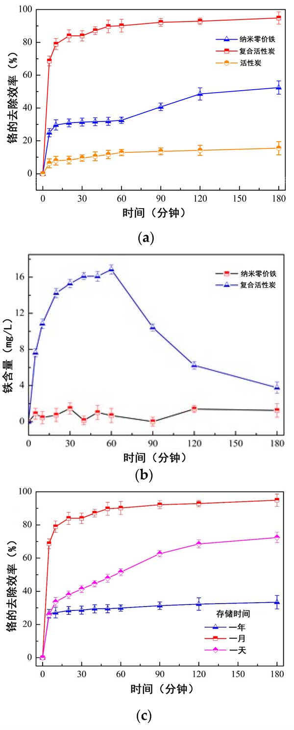 圖3:使用不同材料的總鉻的比較去除效率。(a)活性炭,nZVI和復合材料;(b)溶液中鐵含量的變化;(c)活性炭復合材料具有不同的存儲時間。