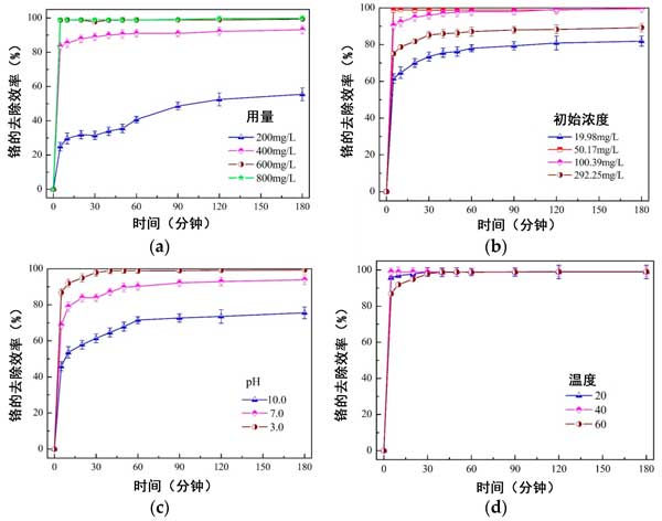 如在示出的圖4中的a,b中,活性炭中的nZVI劑量和初始濃度對總鉻的去除動力學顯著影響。初始去除率隨著活性炭復合材料劑量的增加或初始濃度的降低而逐漸增加,因為提供了足夠的nZVI活性位與鉻反應(yīng)。