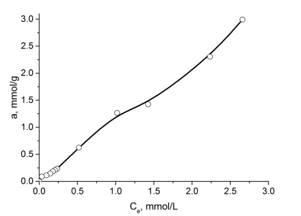圖1顯示了活性炭上鍶離子從水溶液中的吸附等溫線。如圖1所示,即使在較高的平衡濃度下,所顯示的等溫線也具有拐點。坐標中鍶離子的吸附等溫線如圖2所示。通過外推曲線,以圖形方式獲得logKads值;钚蕴康慕Y構參數(shù)由Dubinin–Radushkevich方程根據(jù)苯吸附-解吸等溫線確定。