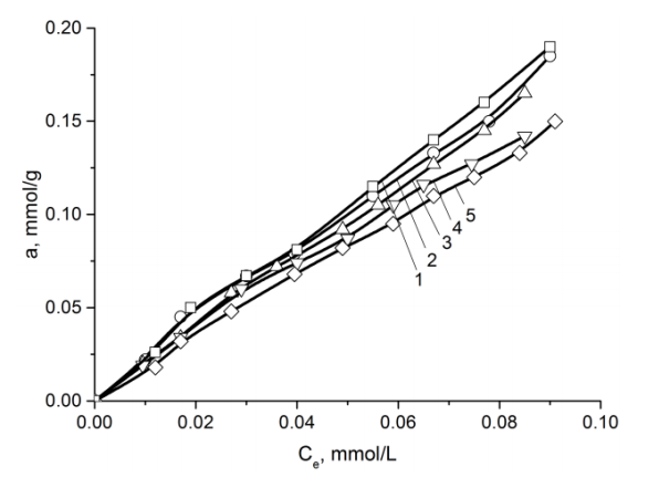 鍶離子的吸附平衡常數(shù)得出吸附平衡常數(shù)等于2,并且ΔG0值分別為0.5 kJ / mol。根據(jù)以前的數(shù)據(jù),活性炭吸附劑-H2O的水界面ΔG0等于2.3 kJ / mol。具有比溶劑(水)低的標準摩爾吸附微分自由能(ΔG0)的吸附劑無法將其從吸附劑表面(從其孔隙)中置換出來,但是鍶離子在相對較高的平衡濃度下被吸附,其值這些離子的吸附量相當大(圖1)。這種現(xiàn)象可以通過以下事實來解釋:在低平衡濃度下,鍶離子與活性炭的多孔結構中的水分子相互作用,從而形成Sr(OH)+離子;钚蕴课⒖捉Y構中Sr(OH)+的形成和擴散過程已有實驗。在相對較高的平衡濃度下,水分子不會因與羧基(-COOH)以及與磷酸鹽和多磷酸鹽基團(P = O,COP)相互作用而與活性炭結合的鍶離子置換。