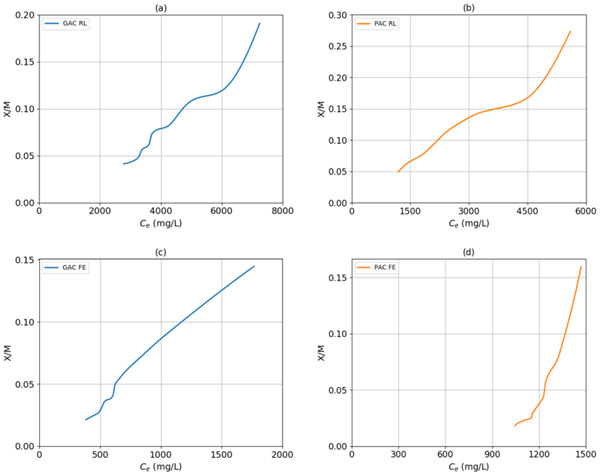 圖1顯示了顆;钚蕴颗c原浸出液,粉狀活性炭與原浸出液,粉狀活性炭與廢液以及粉狀活性炭與廢液的實(shí)驗(yàn)等溫線。兩個樣品的曲線和兩個活性炭對應(yīng)于S形的等溫線(II型)的行為,因?yàn)榍是凹向上,所以多層吸附進(jìn)行活性炭的表面上。利用該信息,就滲濾液而言,不管活性炭顆粒的性質(zhì)和大小如何,都可以假定吸附劑中殘留的化學(xué)需氧量是通過物理吸附發(fā)生的。