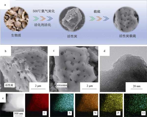 首先,除去生物質(zhì)的污垢和表面雜質(zhì),用清水徹底清洗活性炭原材料,然后用蒸餾水反復(fù)清洗,然后將它們粉碎成碎片,然后在烤箱中100°C下干燥。為了進行預(yù)碳化,將干燥的生物質(zhì)在氮氣氛下的真空管式爐中在500°C的溫度下熱解2小時,以去除少量有機分子。隨后,為了通過化學活化提高比表面積,將預(yù)碳酸化的生物質(zhì)以1:4的重量比浸入作為化學活化劑的水溶液中,然后充分攪拌6小時以確保完全滲透。之后,將混合物在N 2下于900°C退火1小時。最后,用鹽酸反復(fù)洗滌退火后的樣品,然后用過量的蒸餾水沖洗以獲得中性pH。最終樣品通過在80°C的空氣中干燥獲得,并標記為多孔活性炭。相比之下,使用相同步驟制備的未添加活化劑的產(chǎn)品被標記為無孔活性炭。接著使用這兩種活性炭升級成加硫復(fù)合材料,將升華后的硫(純度>99.95%)和相應(yīng)的活性炭粉末(重量比為60:40)充分混合并在研缽中研磨。然后,將獲得的混合物用特氟隆容器密封在高壓釜中。在155°C下熱處理12小時后,獲得了多孔摻硫活性炭和無孔摻硫活性炭復(fù)合材料。