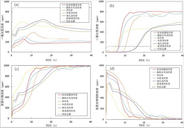 為了測試活性炭在環(huán)境溫度下對氧化和去除的催化和吸附性能。這些簡化的條件與實(shí)際煙氣條件大不相同,后者具有不同的成分和雜質(zhì),并且在不同的壓力和溫度下。但是,這些條件使我們能夠簡化復(fù)雜的系統(tǒng),以更好地了解NO氧化。圖中顯示了在干燥條件下,環(huán)境溫度和壓力下不同活性炭在NO氧化過程中NO,NO 2和氮氧化物的濃度分布圖。NO氧化轉(zhuǎn)化率與運(yùn)行時(shí)間的關(guān)系也可以由NO濃度來計(jì)算的。還計(jì)算了每個(gè)給定時(shí)間的NO入口和氮氧化物出口濃度之間的差異,并顯示為通過吸附去除的氮氧化物量。基線測試代表在相同條件下通過使用無活性炭催化劑的空反應(yīng)器進(jìn)行的測試。穩(wěn)態(tài)NO轉(zhuǎn)化率,氮氧化物的累積量吸附,以及所需要的時(shí)間,以達(dá)到最大的NO濃度或吸附的突然釋放NO 2的出口流中還從濃度曲線中獲得了這些元素。