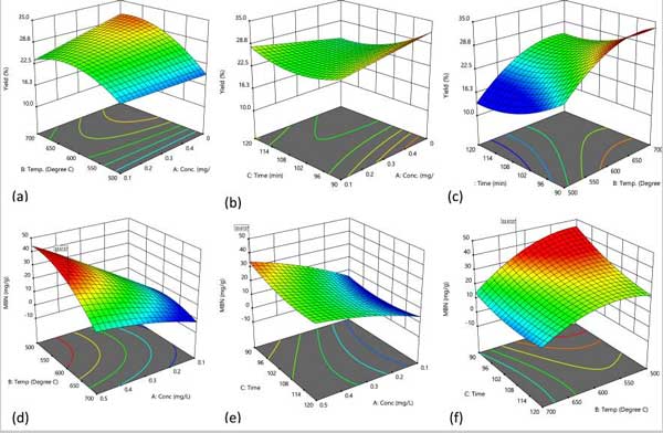 圖1:3-D圖顯示了(a、d)溫度和濃度(b、e)接觸時間以及濃度(c、f)接觸時間和溫度的相互作用對活性炭的百分收率和亞甲基藍(lán)數(shù)的影響。