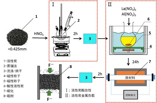鑭鋁改性活性炭的制備包括兩個步驟:酸改性過程(I)和鑭-鋁加載過程(II)。方法I涉及特定質(zhì)量分?jǐn)?shù)的硝酸(HNO3)。將HNO3和活性炭混合在燒瓶中,將燒瓶置于75°C的恒溫水浴中保持2小時。然后,將活性炭洗滌至中性并在100℃下干燥3小時,從而獲得酸改性的活性炭。用鑭(NO3)3·2H2O和鋁(NO3)3加載鑭和鋁的酸改性活性炭。將10g酸改性活性炭在100mL鑭(NO3)3·2H2O和鋁(NO3)3的混合溶液中攪拌24小時。然后,將固體產(chǎn)物在氮氣下于300°C的管式爐中碳化兩小時,冷卻至室溫后,完成鑭鋁改性活性炭,制備和吸附過程示意圖如圖1所示。鑭鋁改性活性炭將用作氟化物的吸附劑。