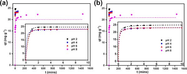 圖2:通過非線性(a)偽一階模型和(b)偽二階模型擬合在4、2、4、6和8的四個不同溶液pH下的實驗吸附動力學(xué)數(shù)據(jù)。實驗數(shù)據(jù)用點表示,等溫線擬合用虛線表示。