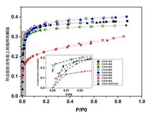 通過氣孔法對環(huán)戊烷吸附/脫附前后的活性炭進行分析,可以進一步洞察一些已經(jīng)發(fā)表的研究,這些研究觀察到了活性炭中環(huán)戊烷的捕集,但沒有確定相關(guān)的孔隙度;钚蕴繉Νh(huán)戊烷水合物結(jié)晶的影響時,液體環(huán)戊烷被活性炭吸收,因為直接吸收比蒸汽吸附更容易在工業(yè)過程中實施。為此,在初級真空下于12小時內(nèi)純化后,向微孔活性炭吸收了一部分液體環(huán)戊烷。