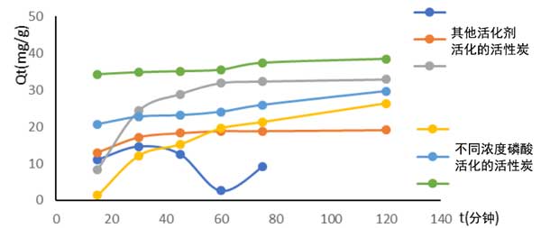 活性炭的吸附時間影響可從圖1看出,活性炭吸附分三步進行:第一是在最初的30分鐘內(nèi),污染物的吸附量很快就被確定了,這可以用在吸附劑的外表面存在大量空置的結合位點,這使得吸附劑易于吸附到該表面。第二在31分鐘后,吸附速率降低,過程緩慢;钚蕴康钠渌恢眠_到飽和后,污染物顆粒將遷移到吸附劑內(nèi)部。由于易于接近,因此吸附過程緩慢:顆粒內(nèi)擴散。第三從80分鐘開始,我們觀察到一次接觸,活性炭已達到其最大容量。我們可以說這些吸附劑的平衡時間是80分鐘。然而,磷酸活化的活性炭吸附量的演化曲線顯示,在最初的30分鐘內(nèi),污染物的吸附量顯著增加,此后,污染物的吸附量急劇下降,這將是一種產(chǎn)物解吸。這一現(xiàn)象在其他吸附劑中是不可見的,這可能意味著可用孔隙的數(shù)量和結合力隨著所用活化劑濃度的增加而增加,這一點還通過碘值和亞甲基藍的值進行了驗證。