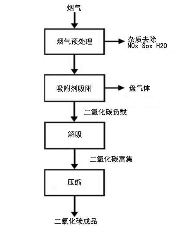 二氧化碳的吸附技術(shù)的簡化圖在圖二顯示。首先將煙氣中的水分,硫和氮氧化物凈化。然后,所制備的氣體進入使用固態(tài)吸附劑的吸附階段,例如活性炭,沸石,金屬有機骨架,多孔聚合物,基于堿金屬和胺的碳酸鹽的固體材料,碳球等。之后,吸附劑進入解吸階段,在此階段釋放出富含CO2的氣體混合物,然后在壓力下將其壓縮。該技術(shù)的優(yōu)點是二氧化碳萃取效率高,再生成本低以及吸附劑操作的穩(wěn)定性;钚蕴繉O2和N2的吸附能力很高,具有不同于沸石的大比表面積,并且還可以在潮濕條件下工作。而且,活性炭比沸石具有更低的吸附熱,因此它們可以更容易地再生。因此,在25°C和1bar的溫度下,活性炭的吸附熱為3kJ,而沸石為30kJ。收集二氧化碳的吸附劑質(zhì)量的重要指標之一是二氧化碳的吸附量。基本上,在靜態(tài)條件下和動態(tài)條件下都進行吸附容量的研究。