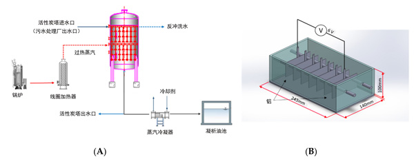 建造了一個用于微塑料去除實驗的中試規(guī)模的設(shè)施,該設(shè)施由帶有熱再生系統(tǒng)的活性炭塔組成。該設(shè)備在接觸塔中運行時的總質(zhì)量約為800千克活性炭。這個設(shè)施是由活性炭單元和過熱蒸汽單元組成的可熱再生裝置。該活性炭塔系統(tǒng)是在污水處理廠上建立的,收集污水樣本以進行微塑料分析。如圖所示圖1A,蒸汽鍋爐中產(chǎn)生高于100℃的飽和蒸汽,并通過管線加熱器轉(zhuǎn)換為500-700°C的過熱蒸汽。蒸汽過熱進行熱解過程,是由轉(zhuǎn)換后的過熱蒸汽通過塔內(nèi)的輻照管噴嘴在有效半徑內(nèi)噴灑到活性炭上,并提高了活性炭的溫度。通過噴灑500-700°C的過熱蒸汽來蒸發(fā)活性炭孔中的水分,并且通過無氧低溫將吸附的一氧化碳或二氧化碳和低分子量化合物與有機物和微塑料分解為水。此時,將未分解的未溶解的低分子量有機化合物與冷凝水混合,并返回到污水處理廠的進水口。從活性炭再生裝置下部排出的蒸汽由熱交換器冷卻,然后引入冷凝水儲罐,并返回到污水處理廠進水或進行后處理。