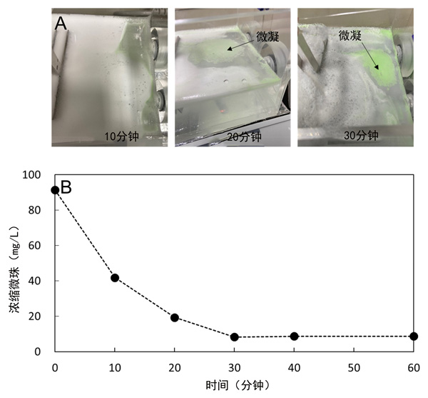 圖3:電凝實驗的結(jié)果:(A)微珠聚集的過程,(B)隨著時間的流逝通過離心濃縮不可分離的微珠。每個數(shù)據(jù)點都是重復(fù)實驗的平均值。
