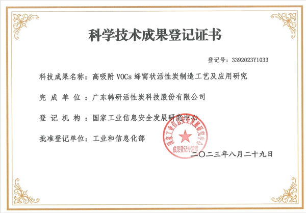 本次科學(xué)技術(shù)成果鑒定由國家工業(yè)信息安全發(fā)展研究中心依據(jù)《中華人民共和國科學(xué)技術(shù)進步法》、《中華人民共和國促進科技成果轉(zhuǎn)化法》、《科學(xué)技術(shù)評價辦法》、《科技評估管理暫行辦法》,在北京主持召開由韓研股份研發(fā)的“高吸附 VOCs 蜂窩狀活性炭制造工藝及應(yīng)用研究”科技成果評價會。期間嚴格按照《科技成果評價試點暫行辦法》的有關(guān)規(guī)定和要求,秉承客觀、公正、獨立的原則,聘請專家對該項科技成果進行評價。評價委員會聽取了項目完成單位的技術(shù)總結(jié)報告,對評價資料進行了審查,經(jīng)嚴格質(zhì)詢和充分討論形成一致意見:本技術(shù)成果達國際先進水平。